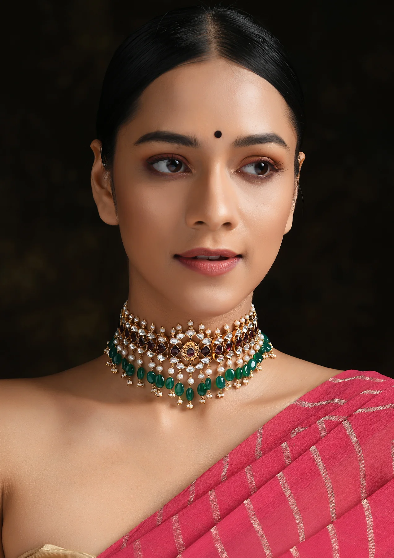 Heavy kundan choker with matching earrings, ideal for weddings.