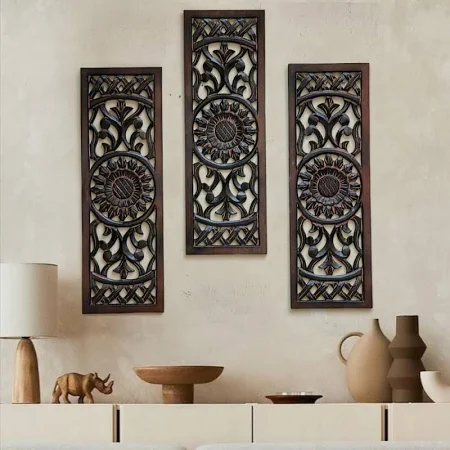 Hand-carved wooden wall hanging with floral patterns.